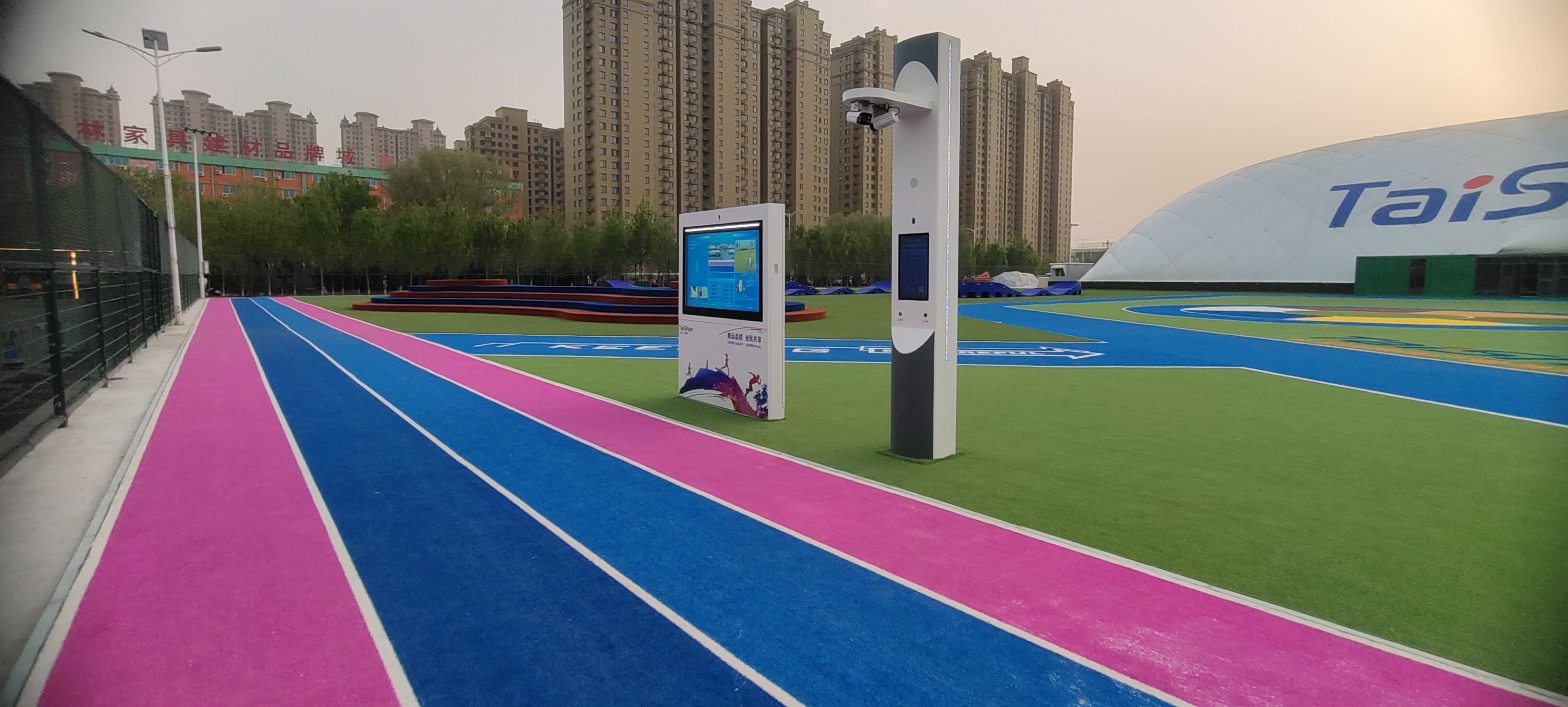沿场地外缘最外侧布置4条500m长健身步道,辅以智能化设备及夜晚导引照明。可以实现手机注册,人脸识别记录运动数据,并提供健身指导,同时保证了夜间锻炼的安全。